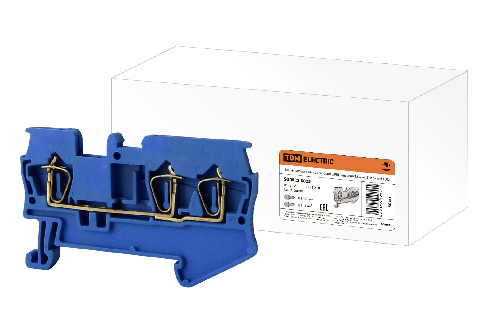 Зажим клеммный безвинтовой (ЗКБ) 3 вывода 2,5 мм2 31А синий TDM