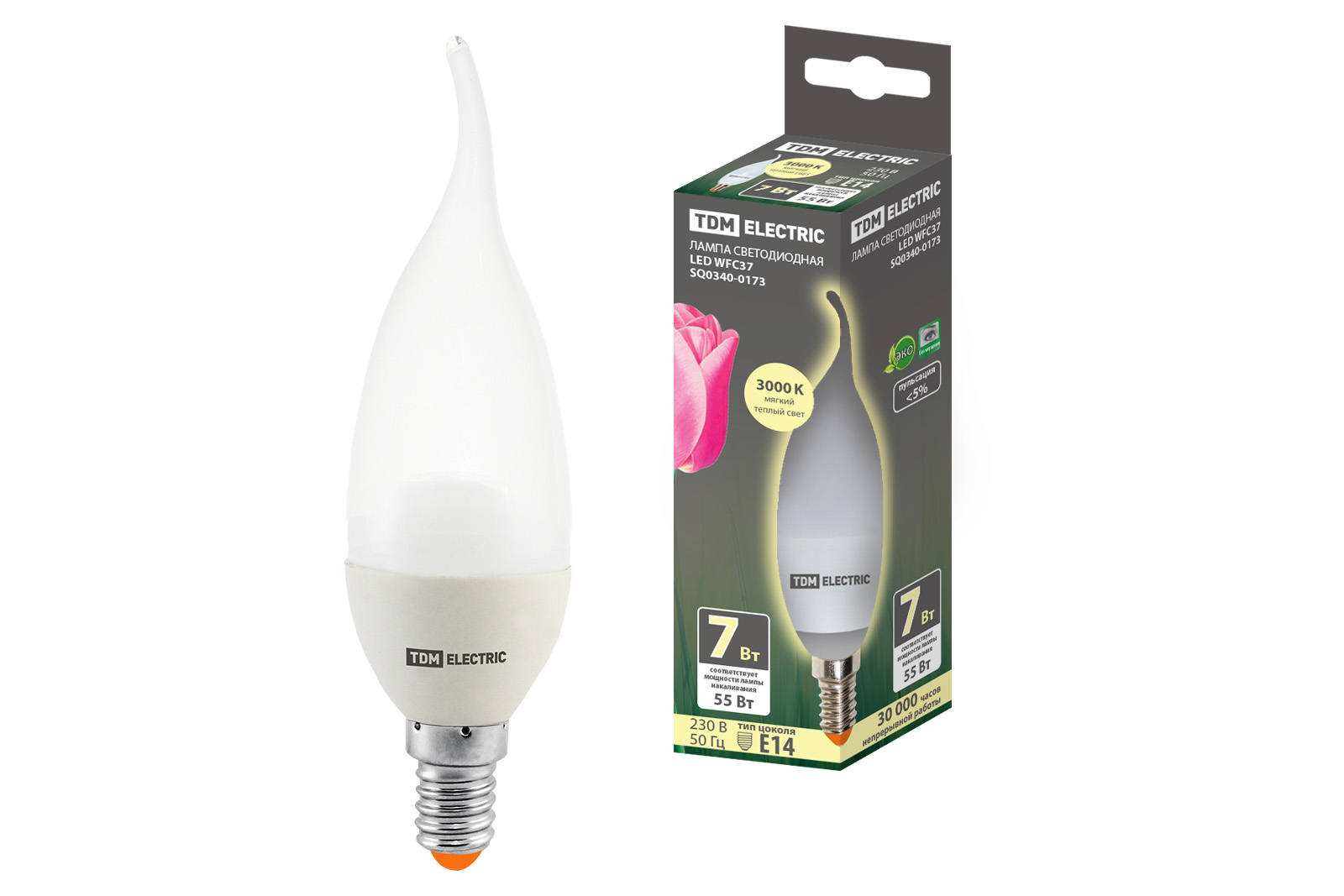 Лампа светодиодная WFC37-7 Вт-230 В -3000 К–E14 (свеча на ветру) TDM