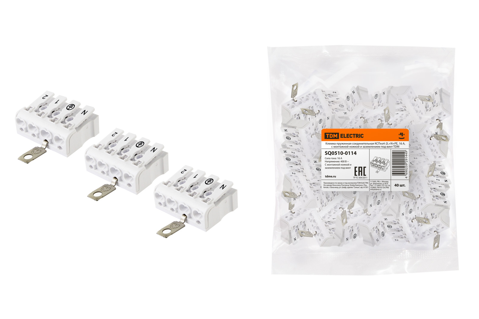 Клемма пружинная соединительная КСПнз4-2L+N+PE, 16 A, с монтажной ножкой и заземлением под винт TDM