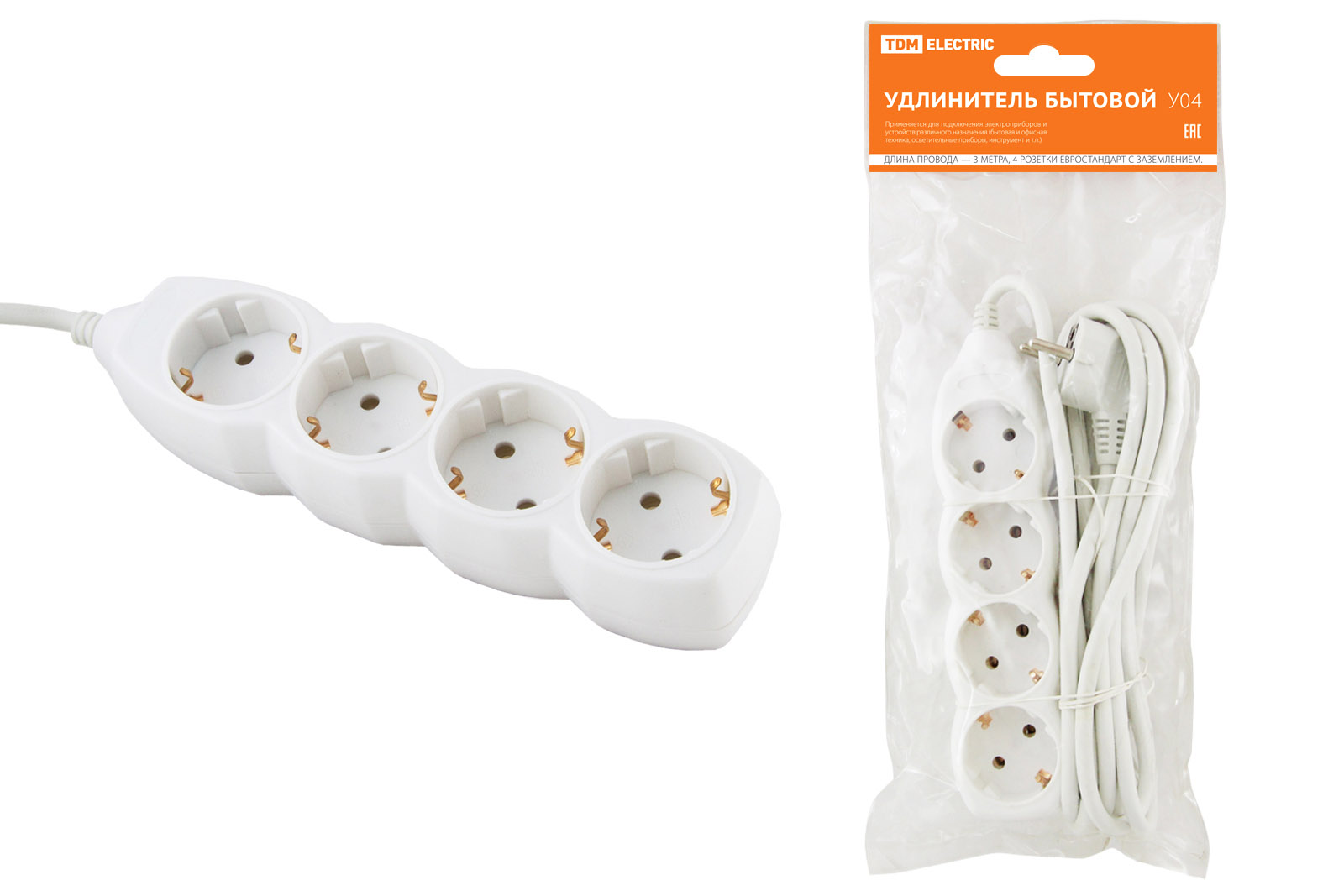 Удлинитель бытовой У04 4 гнезда, 3метра, с заземлением, ПВС 3х1мм2 16А/250В TDM