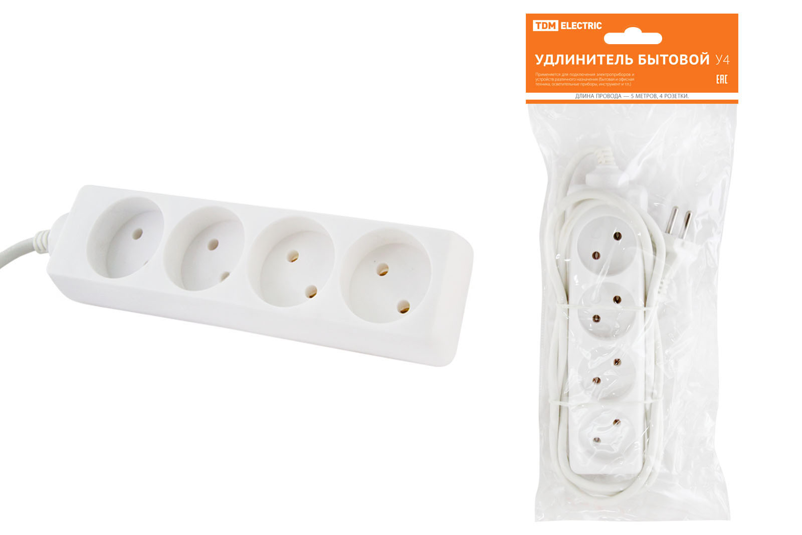 Удлинитель бытовой У4 4 гнезда, 5метров, без заземления, ПВС 2х0,75мм2 10А/250В TDM