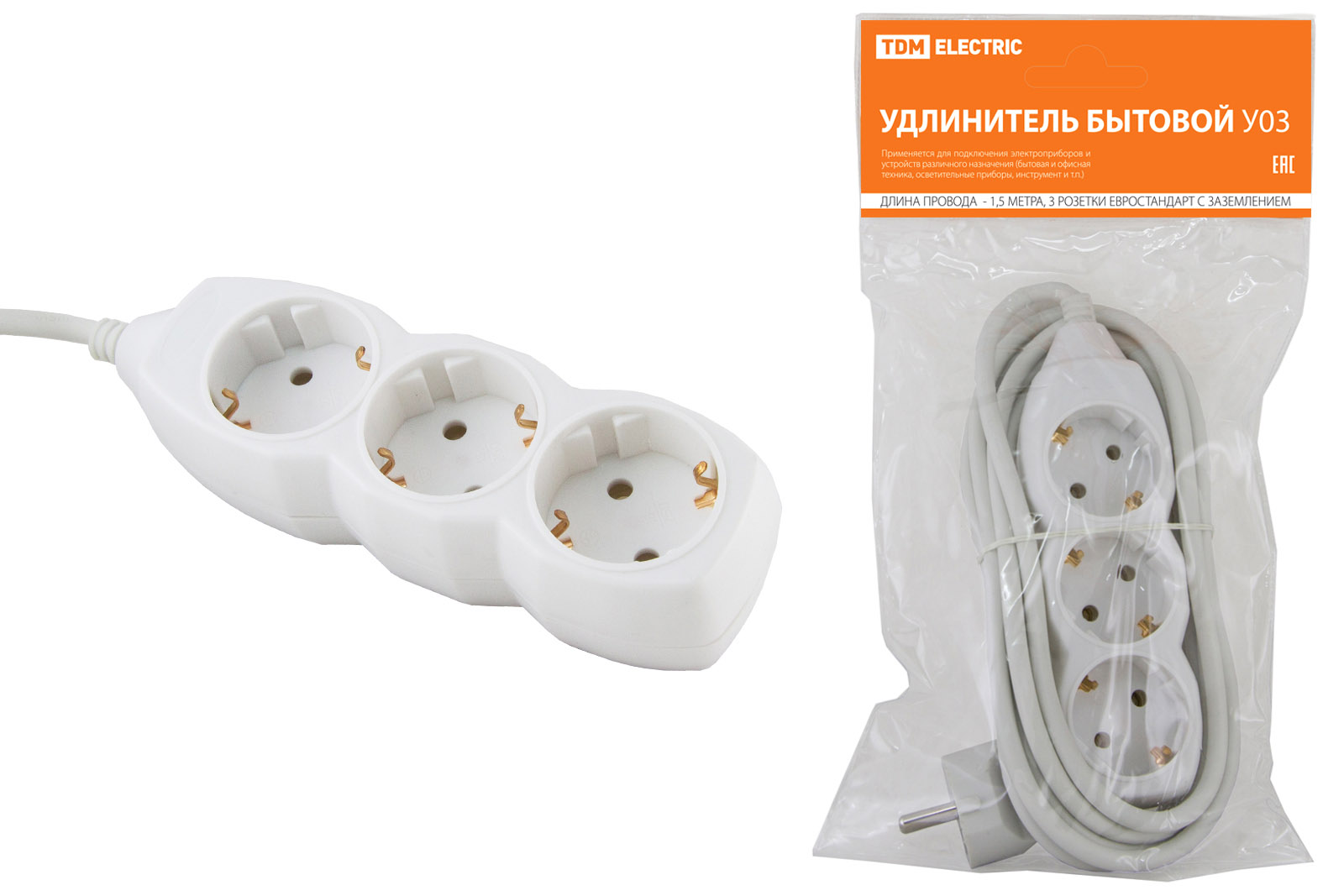 Удлинитель бытовой У03 3 гнезда, 1,5метра, с заземлением, ПВС 3х1мм2 16А/250В TDM