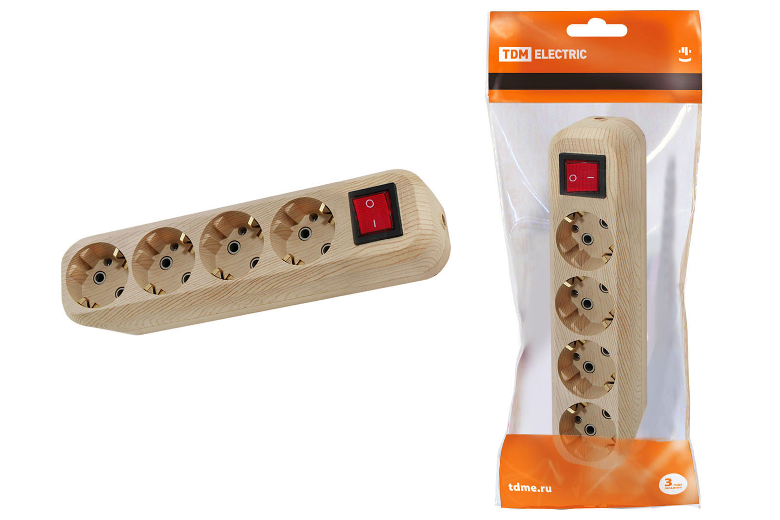 Колодка розеточная 4 гнезда 2П+3 с выключателем16А 250В "Эко" (сосна) TDM