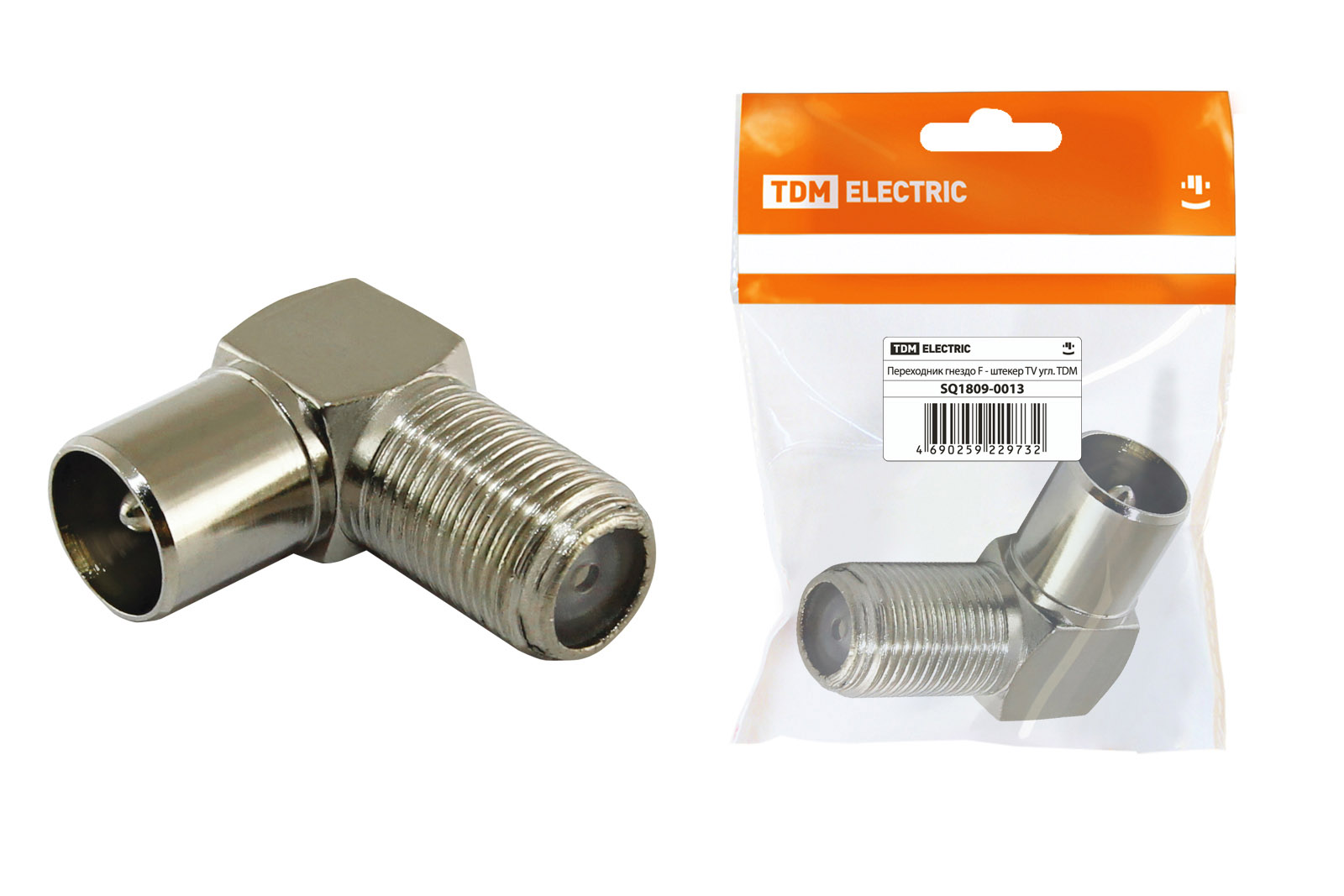 Переходник гнездо F - штекер TV угловой, инд. упаковка TDM