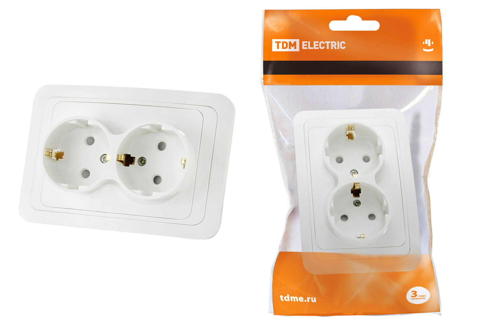 Розетка двойная 2П+З 16А c защитными шторками белая "Валдай" TDM