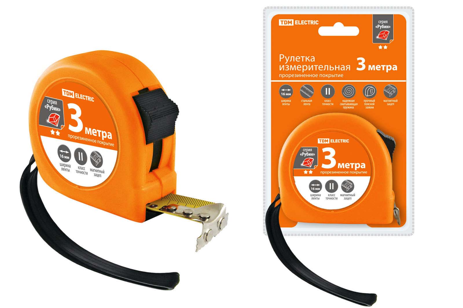 Рулетка, длина 3 м, стальная лента, ширина 16 мм, прорезиненное покрытие, магнит, "Рубин" TDM