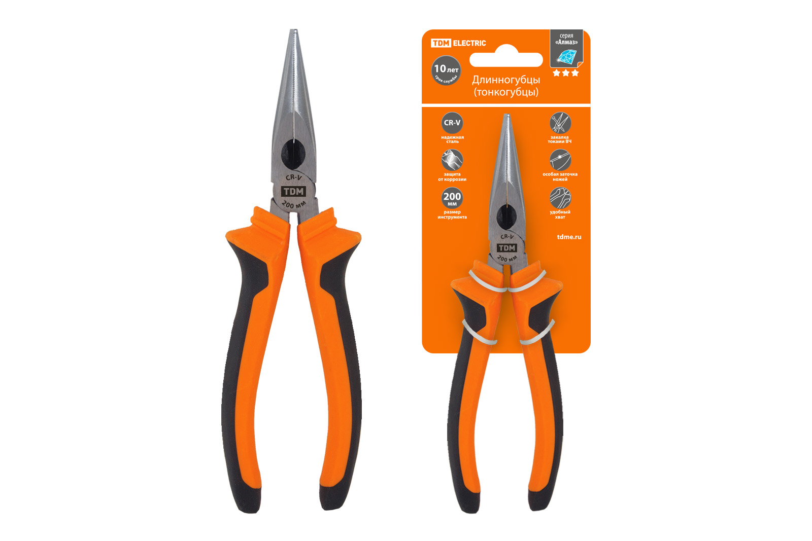 Длинногубцы (тонкогубцы), с двухкомпонентными рукоятками, CR-V сталь, 200 мм, серия "Алмаз" TDM