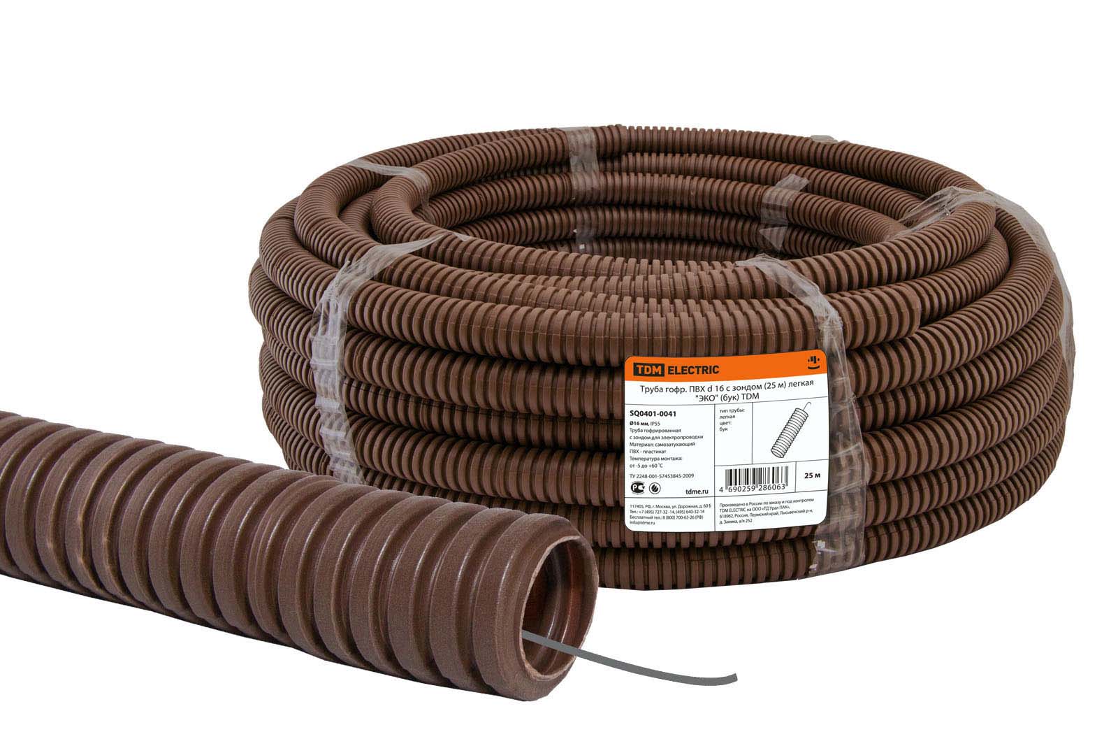 Труба гофр.ПВХ d 16 с зондом (25 м) легкая "ЭКО" (бук) TDM