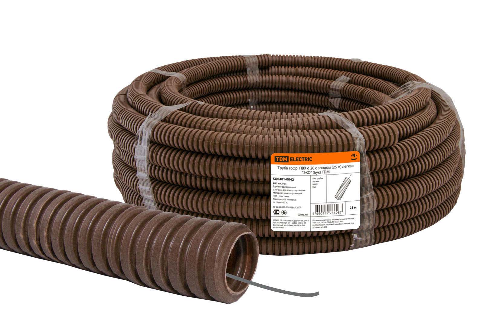 Труба гофр.ПВХ d 20 с зондом (25 м) легкая "ЭКО" (бук) TDM