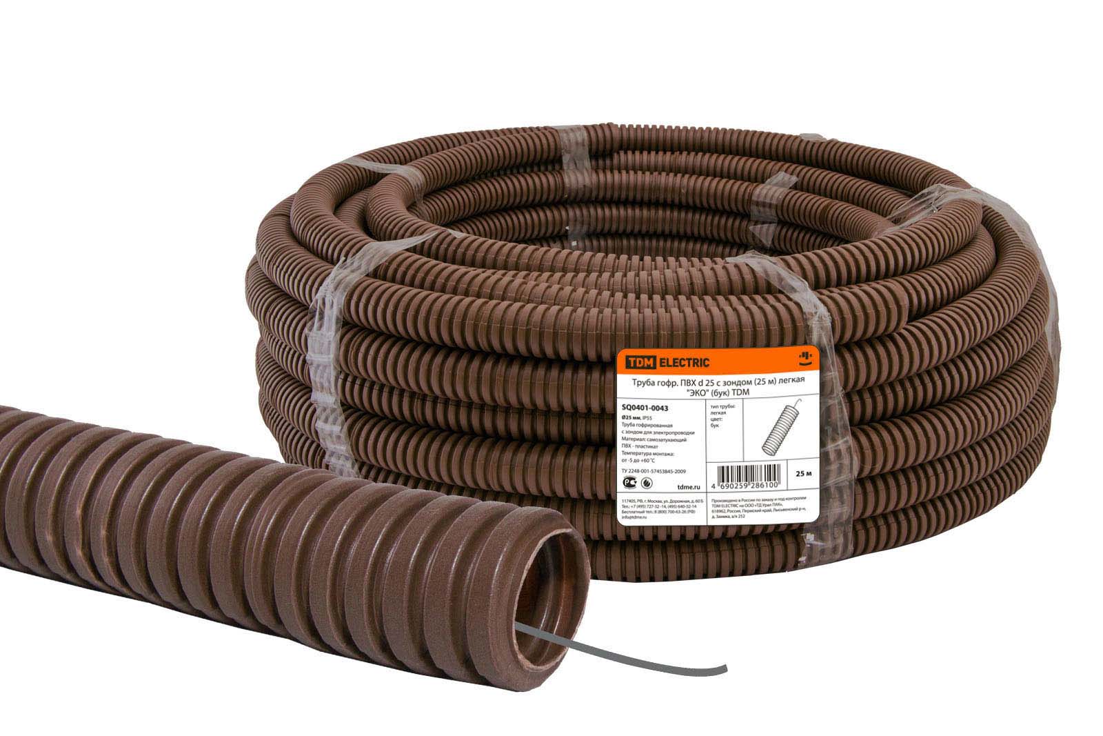 Труба гофр.ПВХ d 25 с зондом (25 м) легкая "ЭКО" (бук) TDM