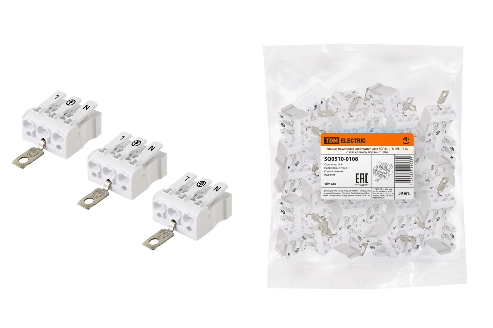Клемма пружинная соединительная КСПз3-L+N+PE, 16 A, с заземлением под винт TDM
