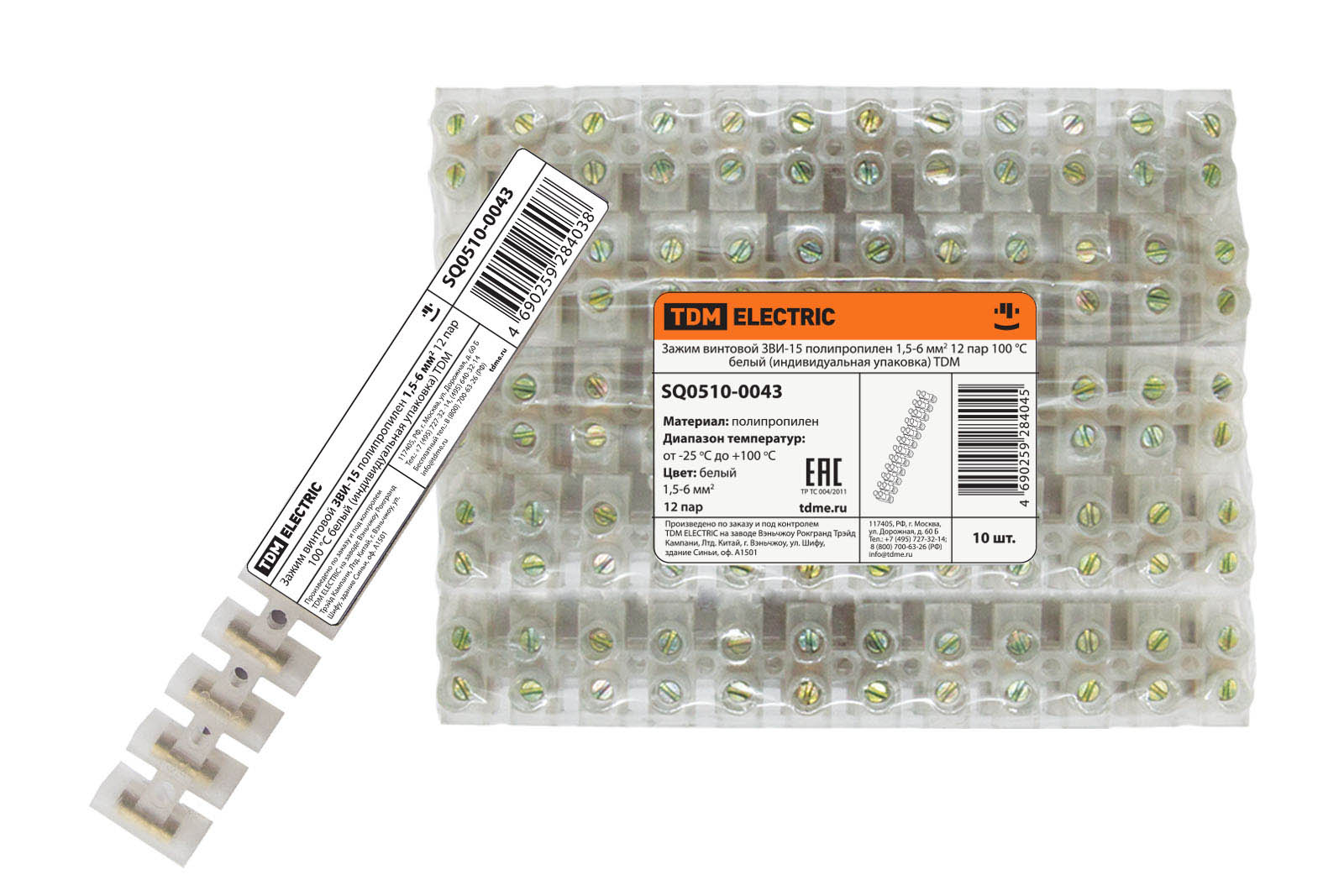 Зажим винтовой ЗВИ-15 полипропилен 1,5-6мм2 12пар 100°С белый (индивидуальная упаковка) TDM