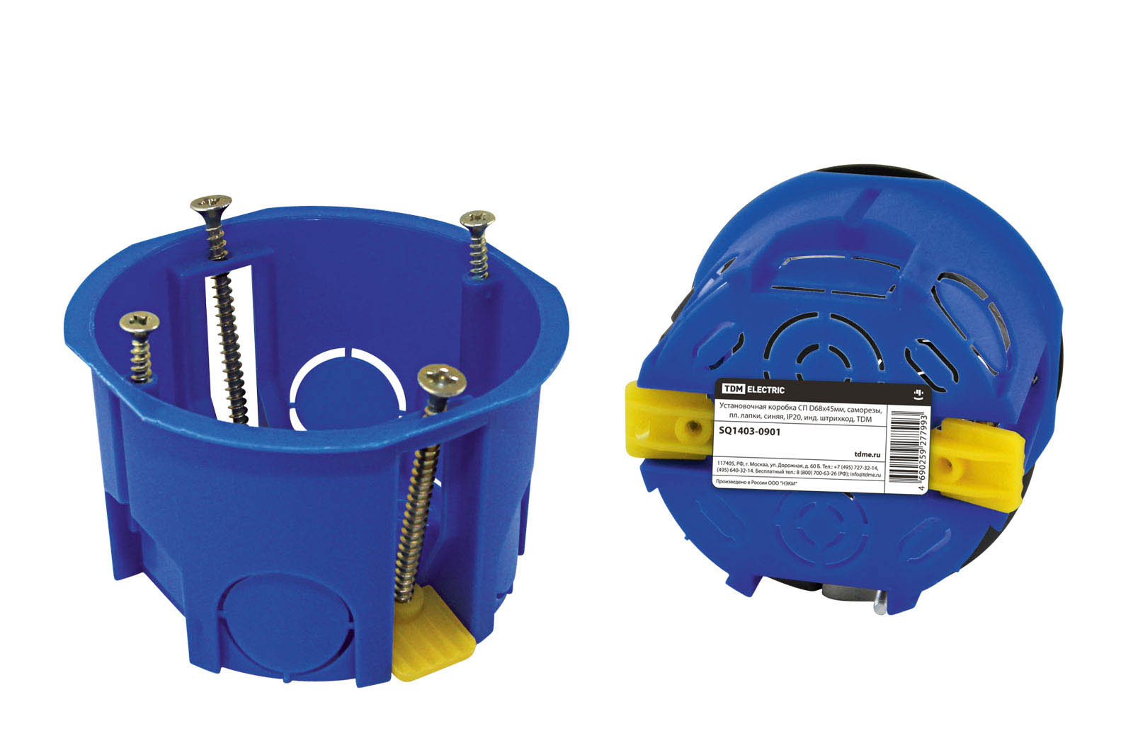 Установочная коробка СП D68х45мм, саморезы, пл. лапки, синяя, IP20, инд. штрихкод, TDM
