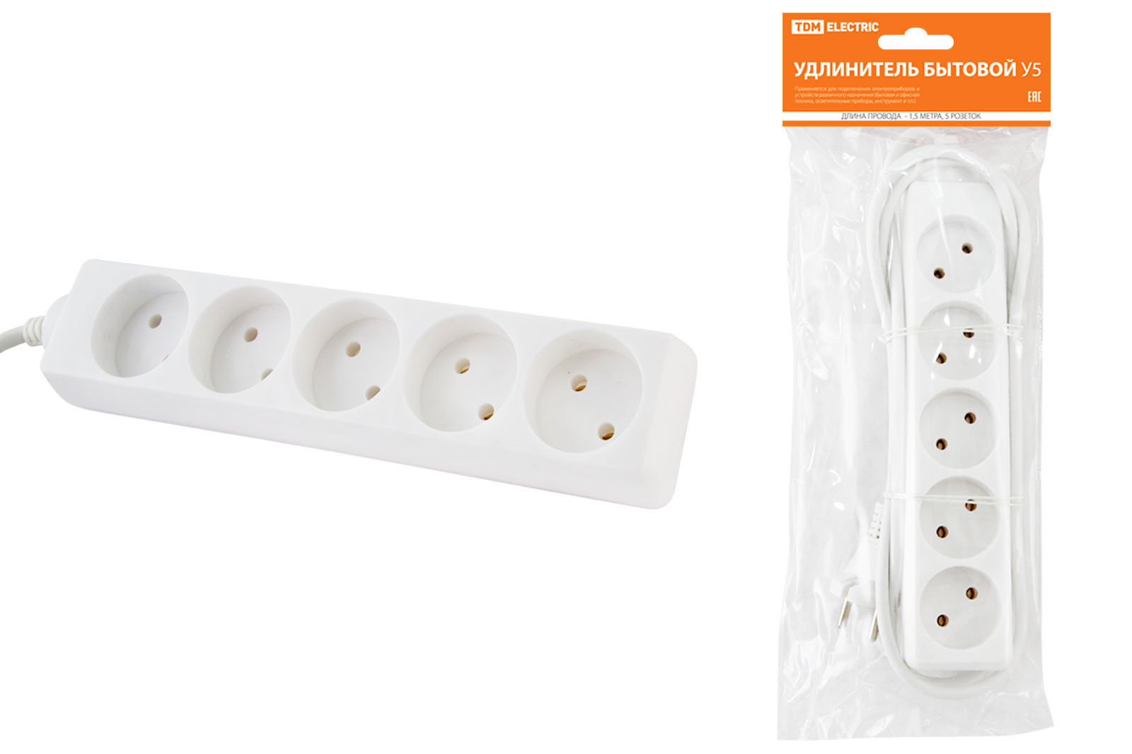 Удлинитель бытовой У5 5 гнезд, 1,5метра, без заземления, ПВС 2х0,75мм2 10А/250В TDM